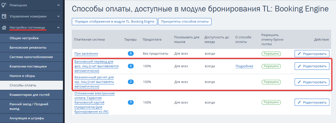2. Перейдите в раздел «Настройки гостиницы» → «Способы оплаты» и кликните на название способа оплаты или на кнопку «Редактировать».