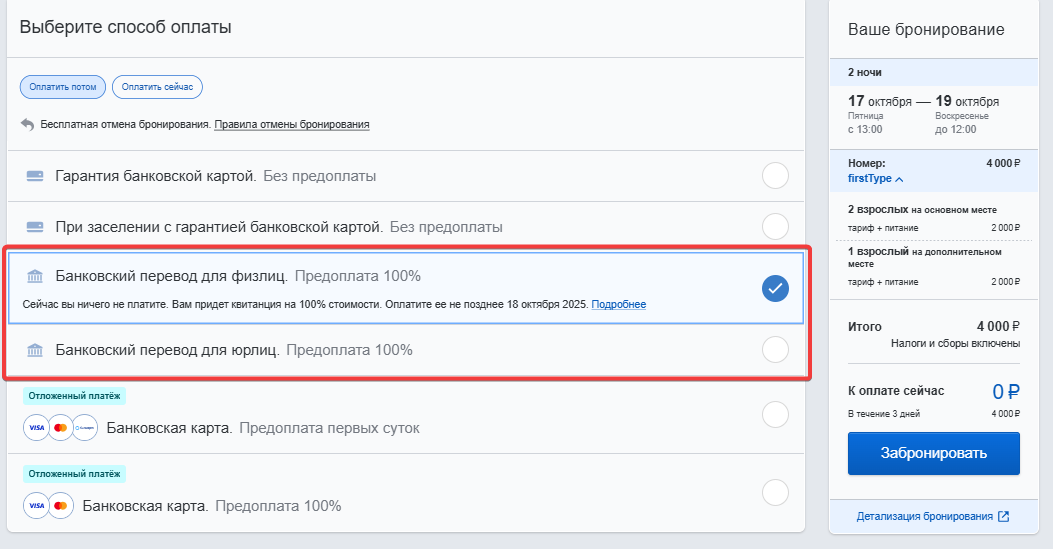 В модуле бронирования гости могут воспользоваться безналичной оплатой бронирования: