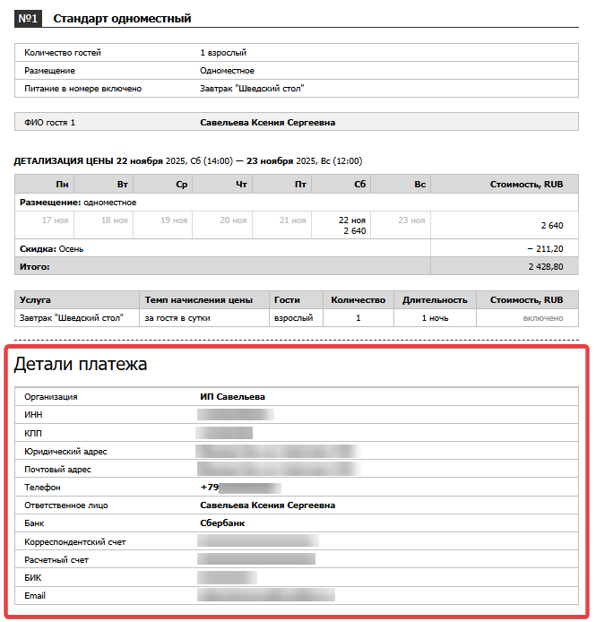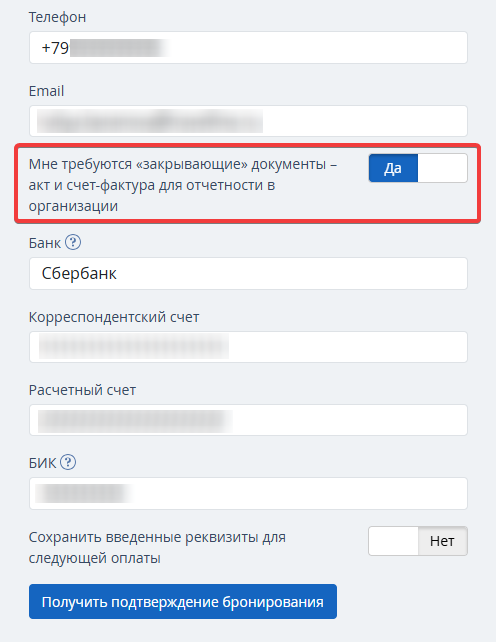 4. В способе «Безналичный расчет для юридических лиц» гость может указать данные банка для подготовки отчетных документов в свою организацию.