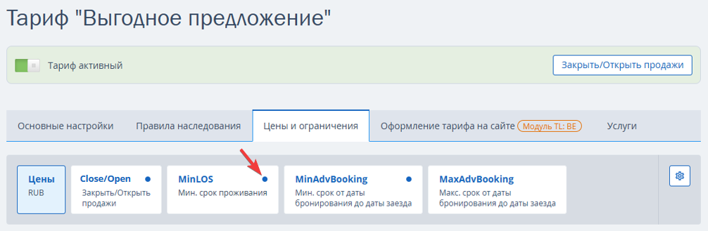 10. Если необходимо скорректировать указанные при создании тарифа параметры, такие как срок проживания и период действия тарифа, перейдите на вкладку «Цены и ограничения». В зависимости от выбранных вариантов будут активны разные ограничения: Close/Open (закрыть/открыть продажи), MinLOS (минимальный срок проживания) и т. д. Активные ограничения отмечены точкой. Более подробно о том, как установить или снять ограничения рассказано в статье: «Как настроить ограничения в тарифе».