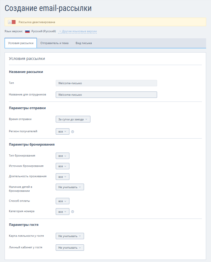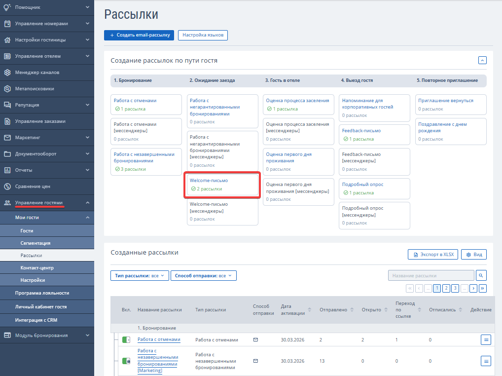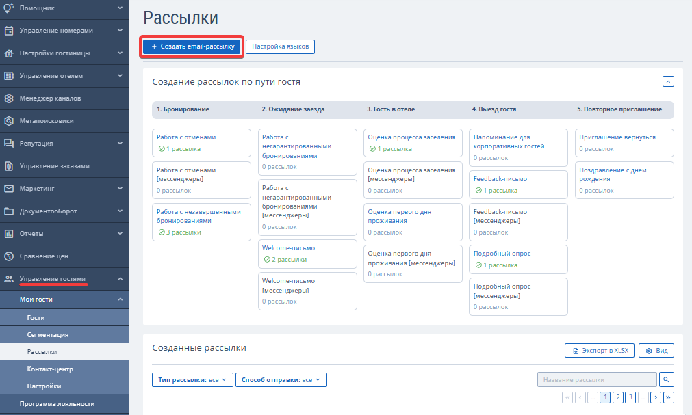 В личном кабинете TravelLine в разделе «Мои гости» → «Рассылки» вы можете создать рассылку двумя способами: