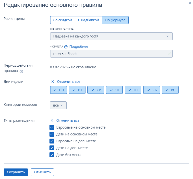 В пункте «Расчет цены» выберите «По формуле», шаблон расчета — «Надбавка на каждого гостя». В формуле сумму 100 замените на стоимость вашего завтрака: rate+500*beds, где: