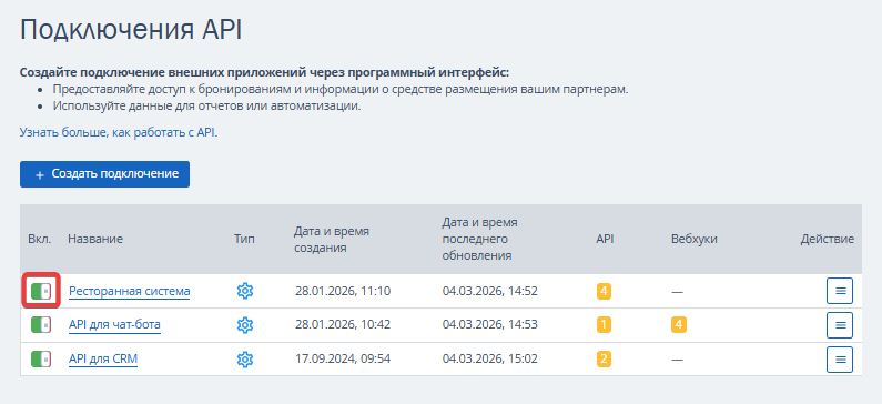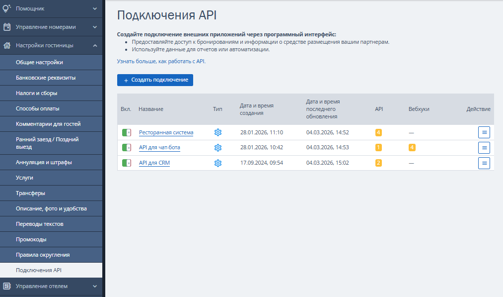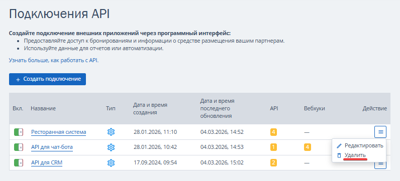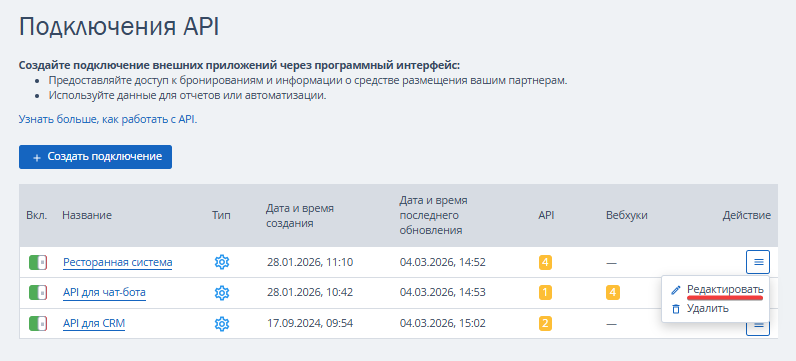 Вы можете изменить, открыть или удалить доступ. Чтобы увидеть список созданных ранее доступов, перейдите в раздел «Настройки гостиницы» → «Подключения API».