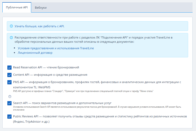 4. На вкладке «Публичные API» поставьте галочки напротив API Платформы TravelLine, к которым вы хотите предоставить доступ.