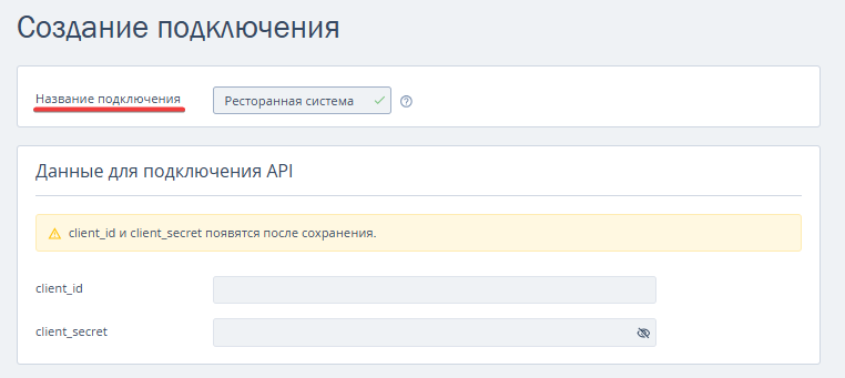Обратите внимание. Поля client_id (логин) и client_secret (пароль) будут заполнены автоматически после сохранения изменений на странице «Создание подключения. Скопируйте эти значения и передайте вашему партнеру. Они будут использоваться для проверки безопасности подключения.