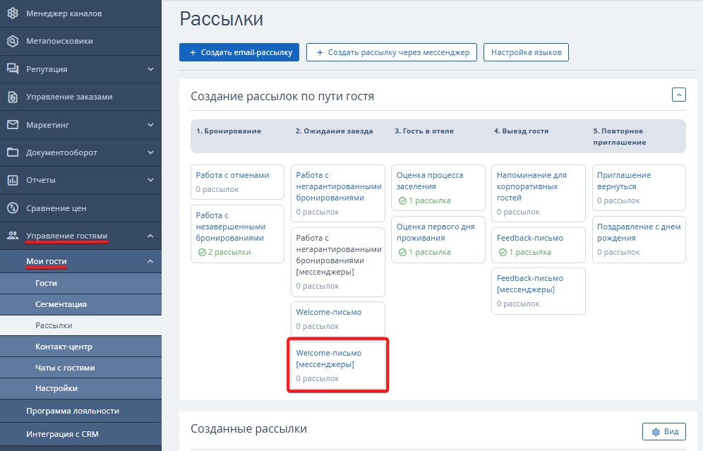 1. Перейдите в личный кабинет TravelLine → «Управление гостями» → «Мои гости» → «Рассылки» и нажмите необходимую рассылку в блоке «Создание рассылок по пути гостя». Читайте подробнее о пути гостя.