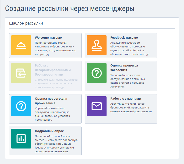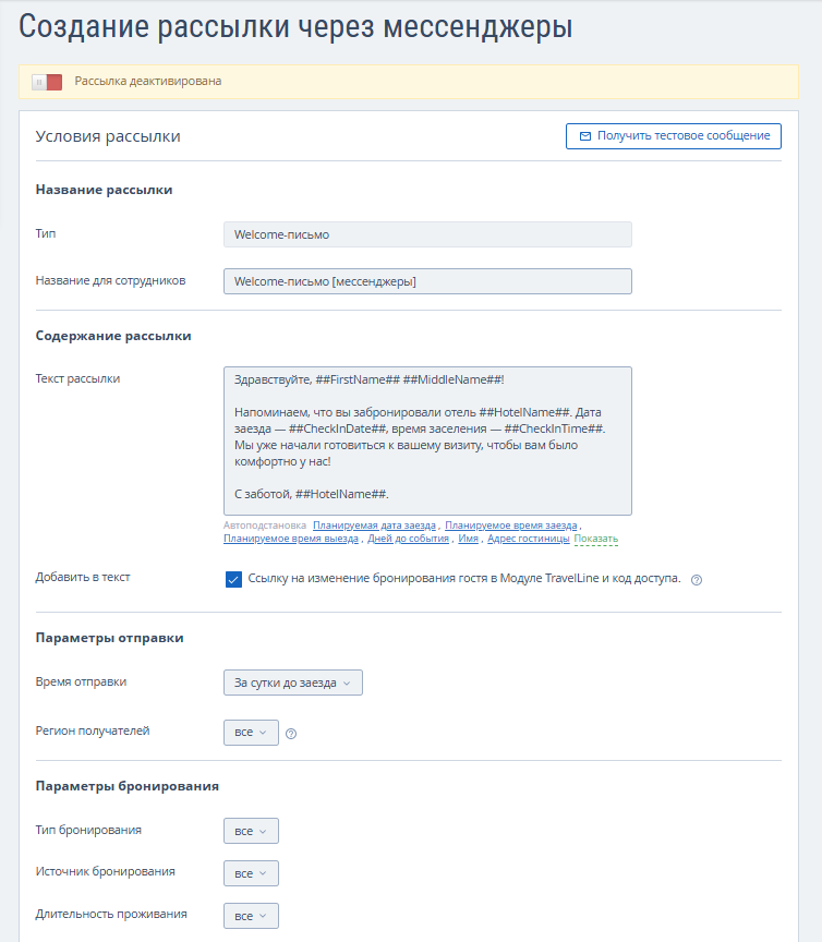 Рассылка использует ту же базу данных гостей, что и email-рассылка. Однако список получателей может отличаться в зависимости от выбранных настроек. Например, в welcome-письме можно настроить отправку всем гостям, тогда как в welcome-письме в WhatsApp — только постоянным гостям.
