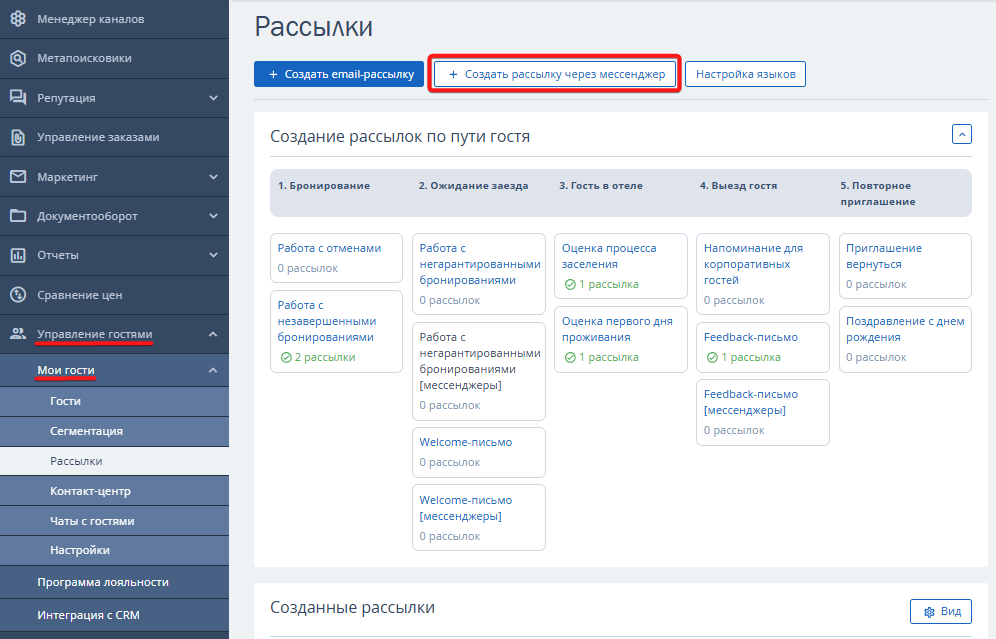 1. Перейдите в личный кабинет TravelLine → «Управление гостями» → «Мои гости» → «Рассылки». Нажмите кнопку «Создать рассылку через мессенджер».