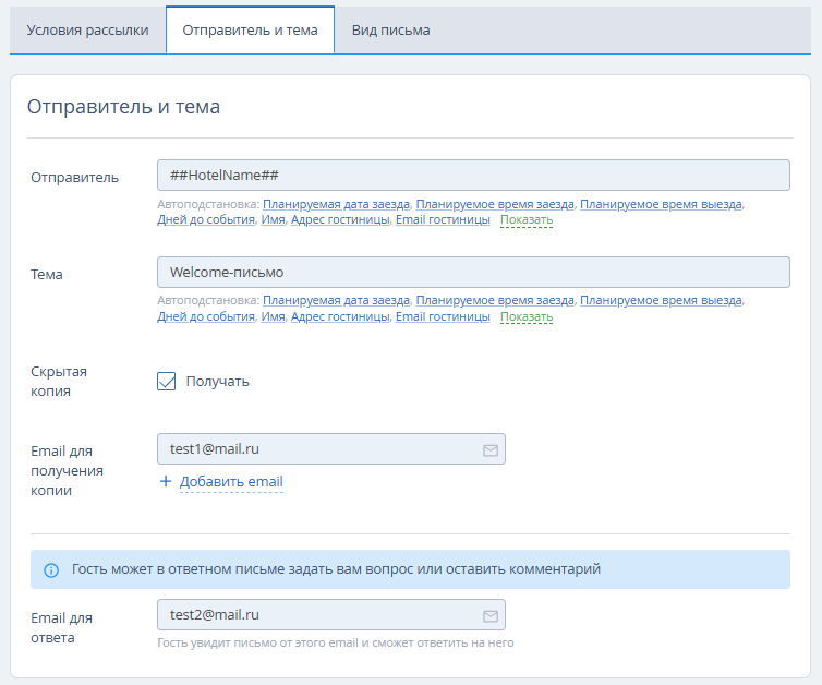 1. На вкладке «Отправитель и тема» укажите отправителя, например, название средства размещения или службы. Используйте автоподстановки.
