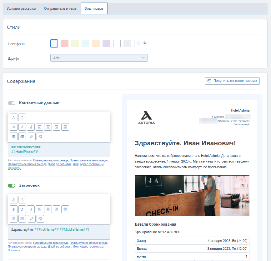 При необходимости, используйте автоподстановки, чтобы данные из бронирования автоматически выгружались в письмо.