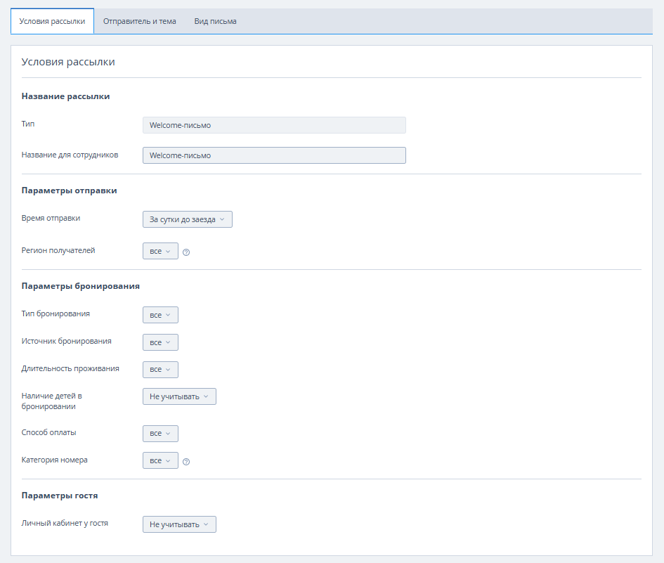 В личном кабинете TravelLine в разделе «Мои гости» → «Рассылки» нажмите кнопку «Создать email-рассылку», выберите «Welcome-письмо». Откроется вкладка «Условия рассылки». Подробнее о том, как создать рассылку, читайте в статье «Как создать email-рассылку в TL: GMS».