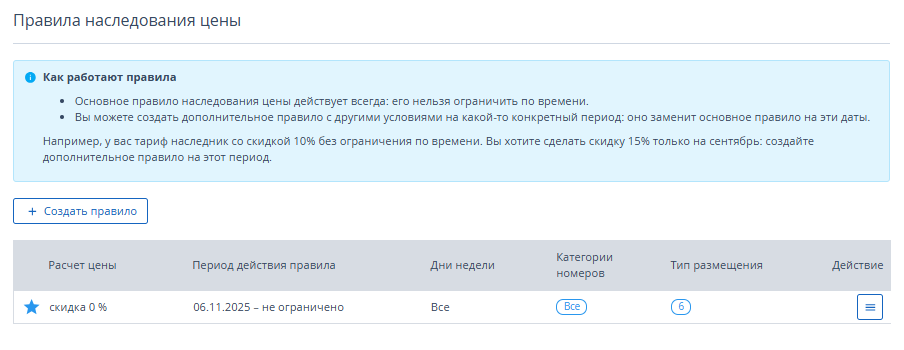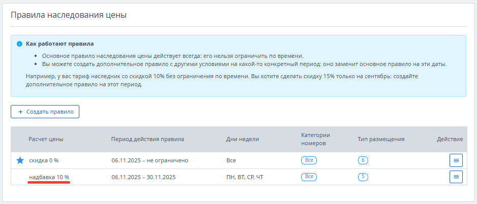 Например, у вас создан тариф-наследник со скидкой 10% без ограничения по времени. Вы хотите сделать скидку 15% только на сентябрь. Создайте дополнительное правило на этот период.