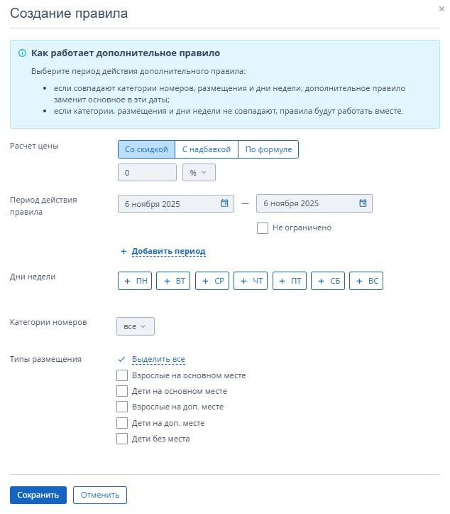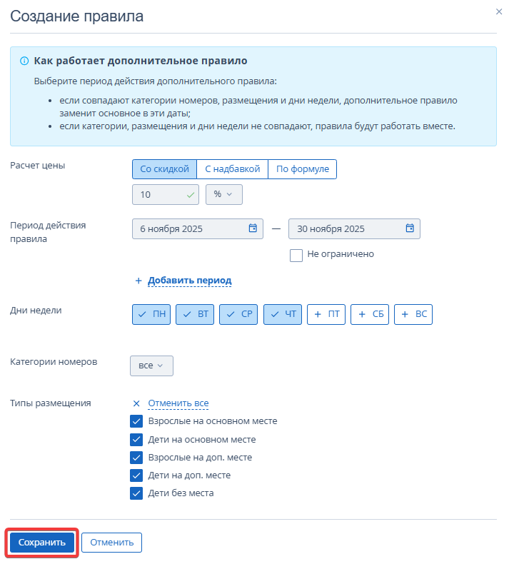 Дополнительное правило не может быть сохранено, если период действия, дни недели, категории номеров и выбранные размещения уже участвуют в другом правиле, то есть выбранные настройки пересекаются частично или полностью.