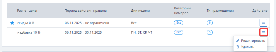 Вы можете редактировать и удалять созданные правила в тарифе.
