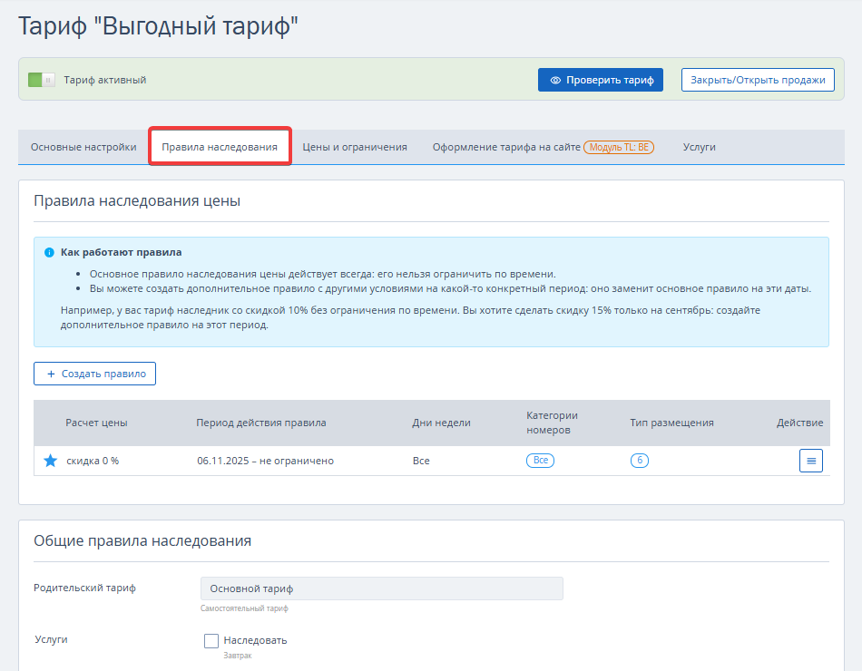 В настройках тарифа-наследника, перейдите на вкладку «Правила наследования».