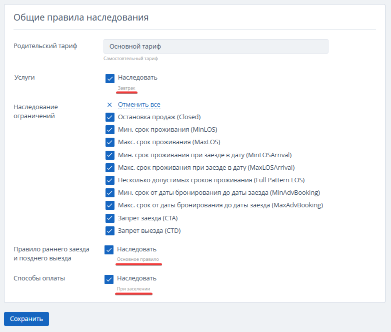 Обратите внимание. В пунктах «Услуги», «Правило раннего заезда и позднего выезда» и «Способы оплаты» можно увидеть, какие настройки выбраны в родительском тарифе, и принять решение, нужно ли их наследовать.