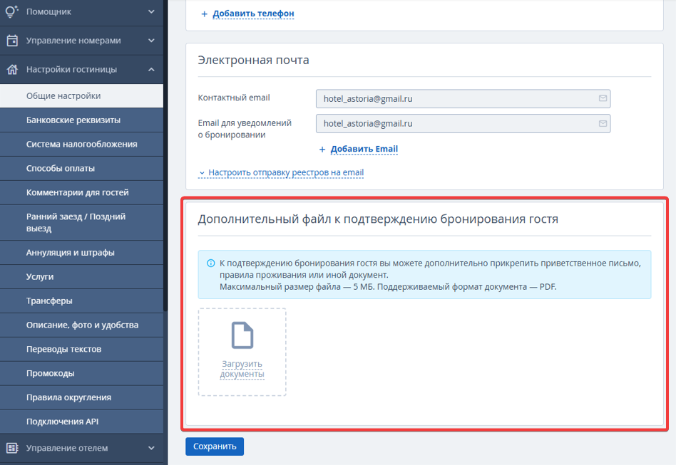 1. Перейдите в раздел «Настройки гостиницы» → «Общие настройки» и найдите блок «Дополнительный файл к подтверждению бронирования гостя».