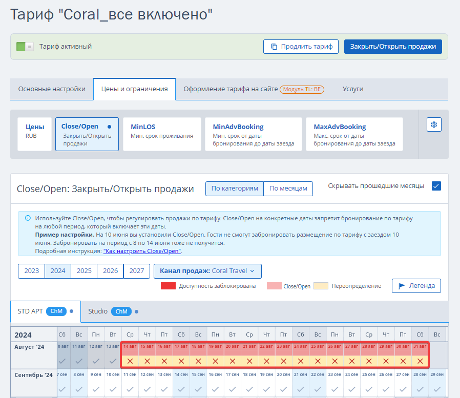Обратите внимание. В тарифе на вкладке «Цены и ограничения» → Close/Open (закрыть/открыть продажи) ячейки с датами, в которые остановлены продажи, будут окрашены желтым цветом, так как значение в этих ячейках переопределено.