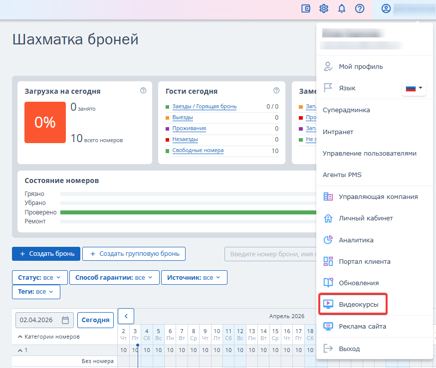 Когда все необходимые компоненты подключены в личном кабинете TravelLine, и вы только начинаете с ними работу, при входе вы увидите всплывающее окно с приветственным сообщением и кнопкой «Начать обучение». По кнопке откроется модуль «Видеокурсы».