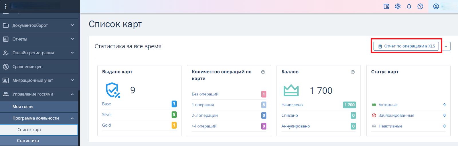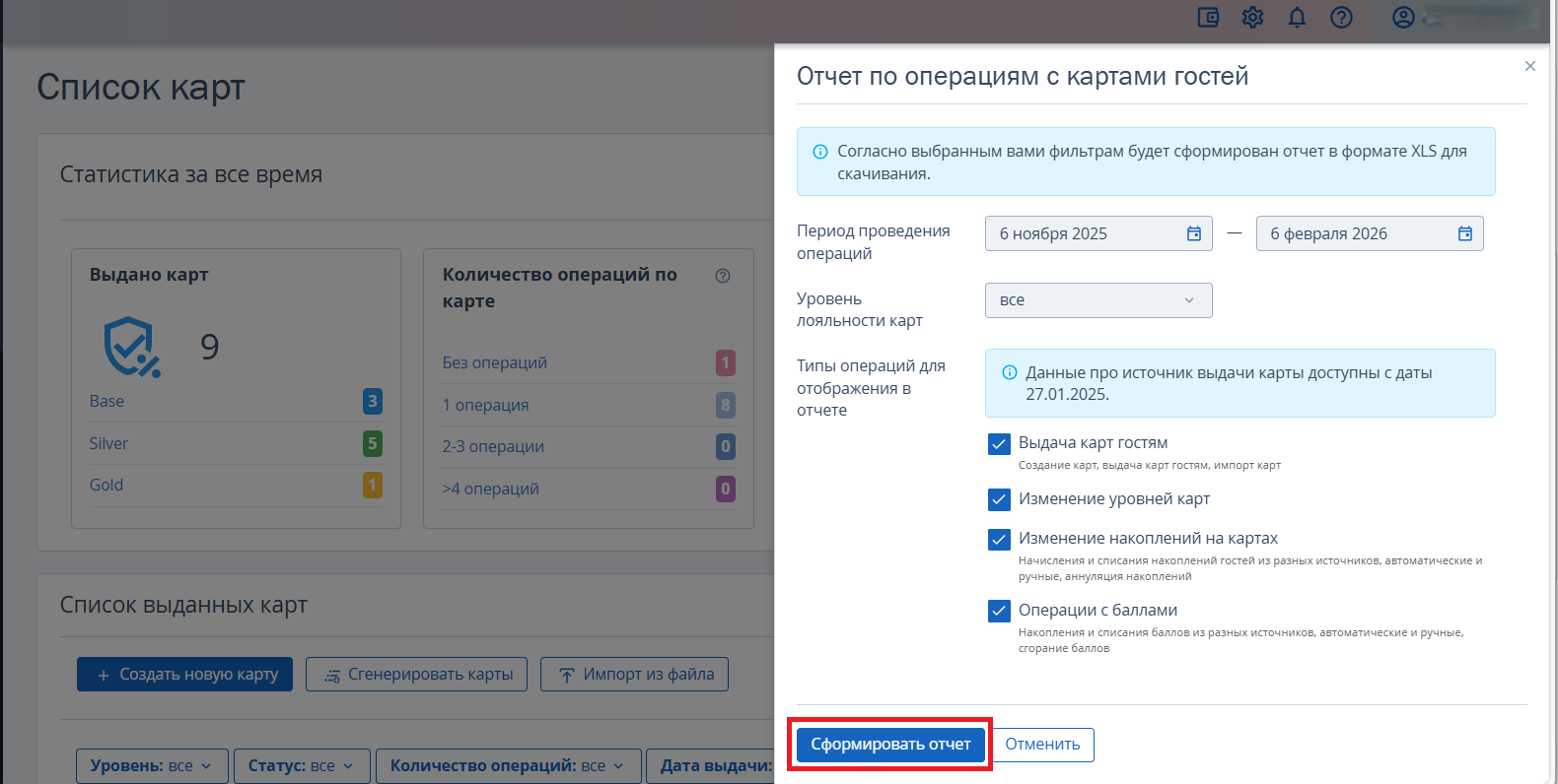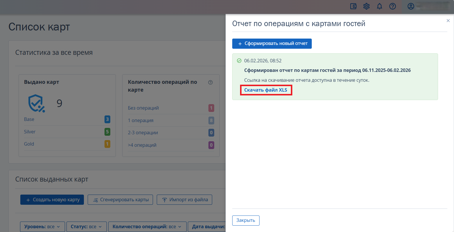 На странице «Список карт» вы можете сформировать и загрузить отчет по операциям с картами лояльности гостей в Excel-формате. Используйте этот отчет, чтобы провести глубокий анализ действий по картам.