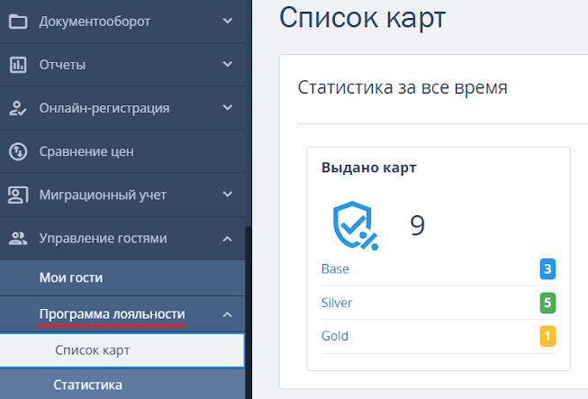 1. Перейдите в раздел «Управление гостями» → «Программа лояльности» → «Список карт».