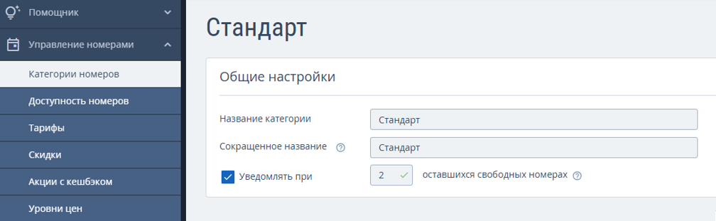 Для настройки перейдите в раздел «Управление номерами» → «Категории номеров» → перейдите в нужную категорию номера. Поставьте галочку «Уведомлять при N оставшихся свободных номерах» и укажите количество номеров.
