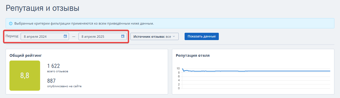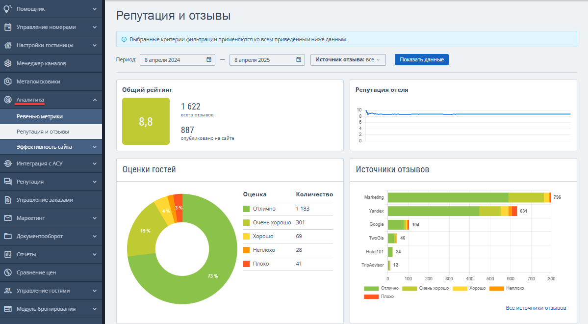 Раздел «Репутация и отзывы» в TL: Аналитике позволяет отслеживать и анализировать отзывы гостей о средстве размещения из различных источников. Мониторинг и анализ отзывов улучшает качество обслуживания и репутацию средства размещения.