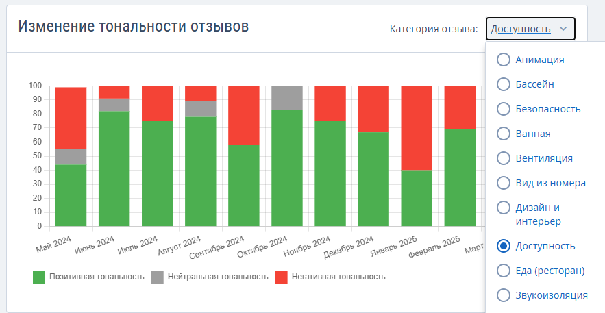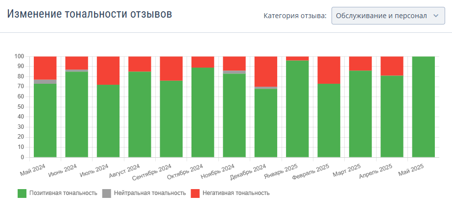 В разделе «Анализ категорий отзывов с помощью ИИ» все отзывы распределяются по категориям и тональности с помощью модуля TL: Reputation на основе ИИ. Подробности читайте в статье «Анализ и ответы на отзывы с помощью искусственного интеллекта в TL: Reputation».