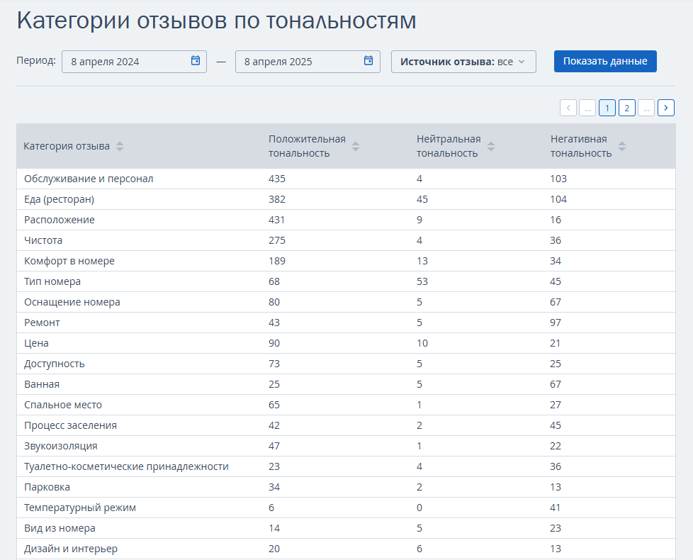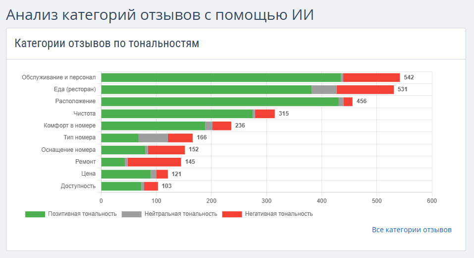 Если нажать на ссылку «Все категории отзывов», откроется страница с таблицей, которая содержит все данные по категориям и тональности.