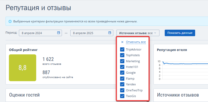 3. В раскрывающемся списке отметьте галочками источники отзывов.