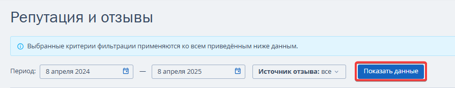 Обратите внимание. Выбранные критерии фильтрации будут применяться ко всем данным на странице. По умолчанию показываются данные за последний год, при необходимости можно указать другой период.