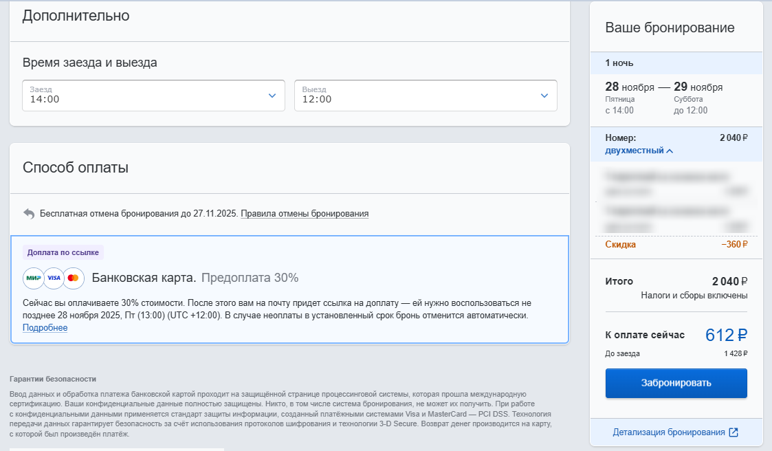 1. На шаге выбора способа оплаты, гость выбирает способ «Банковская карта. Доплата по ссылке» и нажимает кнопку «Забронировать».