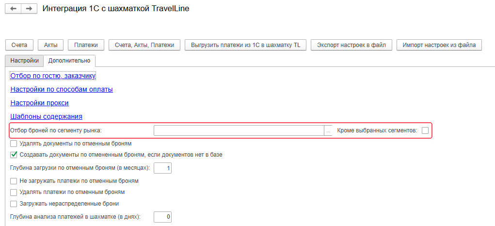 Также на вкладке «Дополнительно» настраивается отбор броней по сегменту рынка. Эта настройка позволяет выбрать из TL: WebPMS нужные сегменты рынка, по которым будут загружаться брони в 1С.