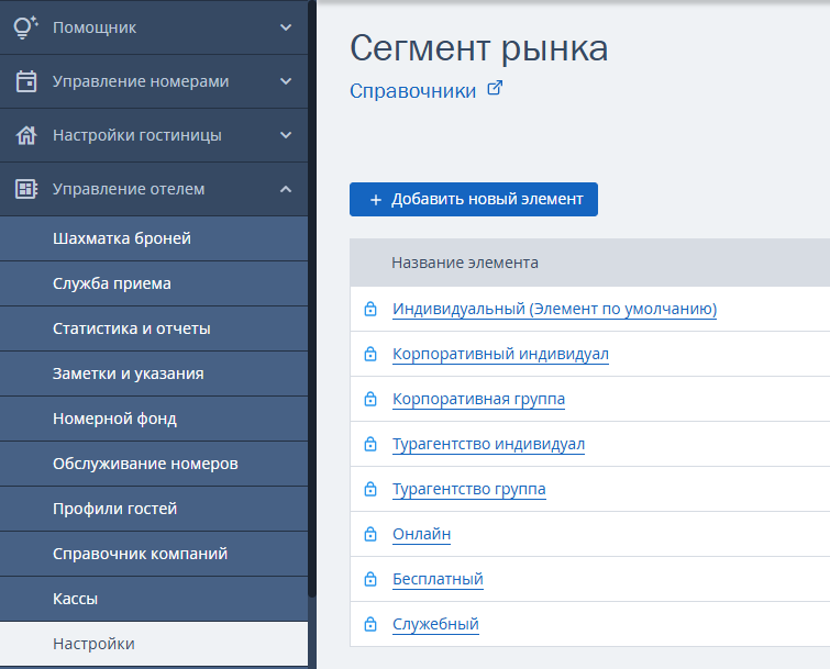 Сегменты рынка настраиваются в TL: WebPMS в разделе «Управление отелем» → «Настройки» → вкладка «Справочники».