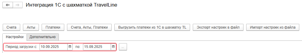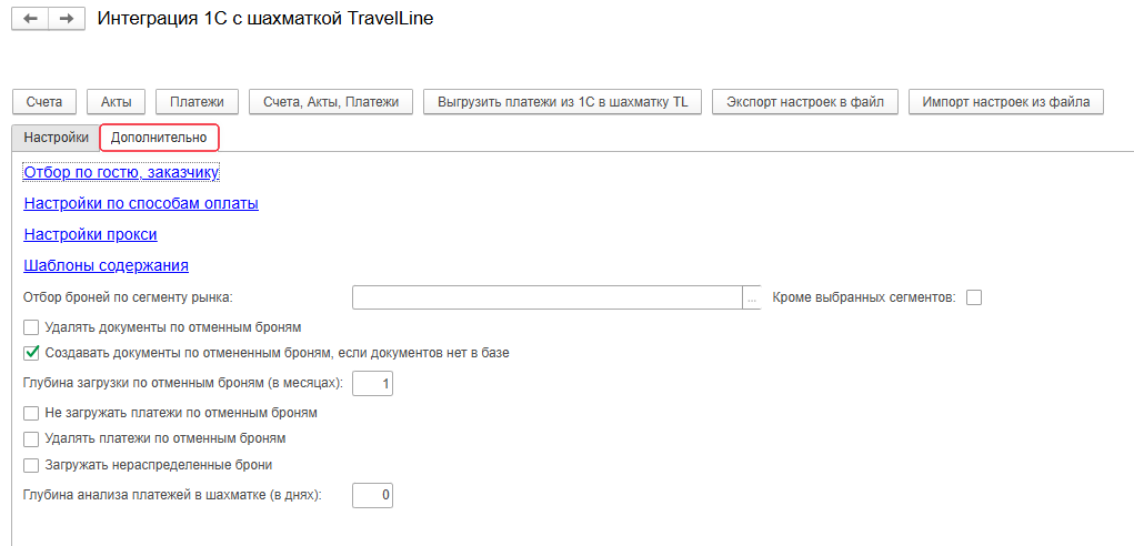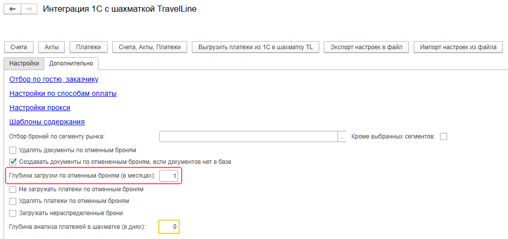 Например, если выбран период загрузки с 10.09 по 15.09, а глубина загрузки по отмененным броням установлена 1 месяц, то 1С при загрузке данных будет искать и загружать отмененные брони, начиная с 1 августа по 10 сентября.