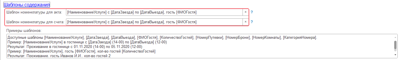 Шаблоны содержания позволяют автоматически подставлять данные в счета и акты в 1С при загрузке документов в 1С из TL: WebPMS. Можно использовать следующие параметры: НаименованиеУслуги, ДатаЗаезда, ДатаВыезда, ФИОГостя, КоличествоГостей, НомерПутевки, НомерБрони, НомерКомнаты, КатегорияНомера.