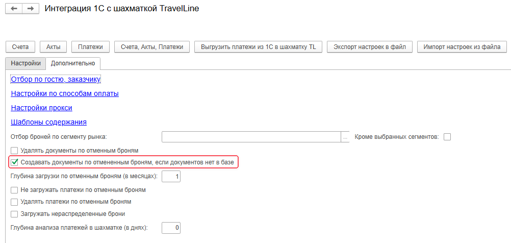 В 1С можно настроить создание документов по отмененным броням из TL: WebPMS с помощью опции «Создавать документы по отмененным броням, если документов нет в базе».