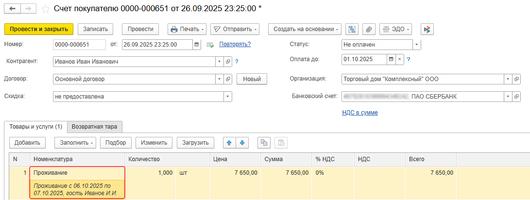 Например, если для шаблона счета выбрать данные [НаименованиеУслуги] с [ДатаЗаезда] по [ДатаВыезда], а также информацию о госте [ФИОГостя], то в документе 1С в столбце «Номенклатура» отобразятся данные: Проживание, даты 06.10.2025 —07.10.2025, ФИО гостя: Иванов И.И.