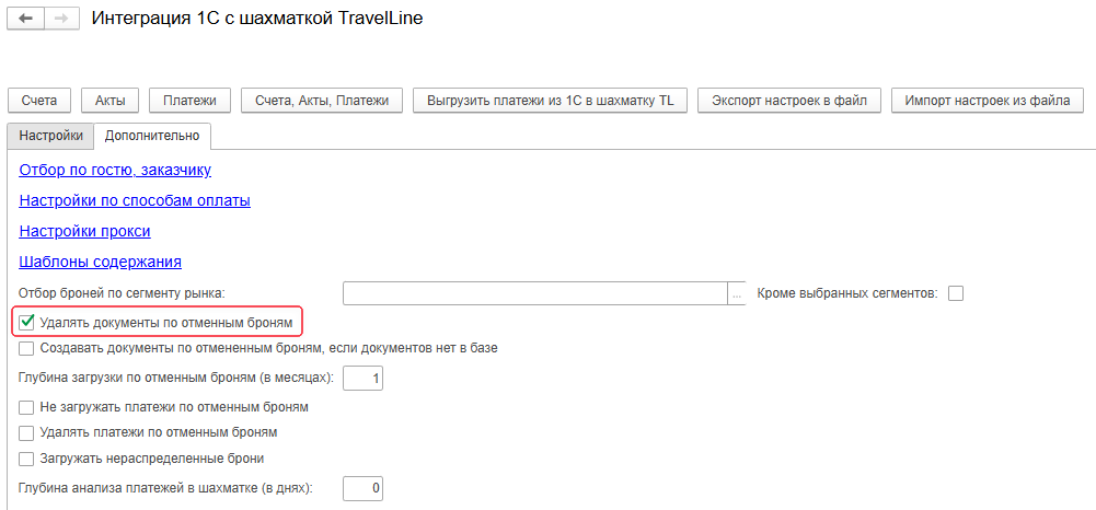 При активации опции «Удалять документы по отмененным броням», когда бронирование отменяется в TL: WebPMS, соответствующие документы начислений в 1С будут автоматически помечаться на удаление при загрузке за период с настроенной глубиной. Чтобы система понимала, за какой период нужно пометить на удаление отмененные брони, следует указать значение в поле «Глубина загрузки по отмененным броням».